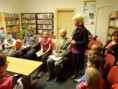 Fotografie dokreslují příjemnou atmosféru při setkání nad knihou a kronikou obce dne 18.10.2013 v nově vymalované knihovně. Knihovnice obce paní Navrátilová seznámila účastníky besedy s chodem knihovny, počtem knih, pravidelnou cirkulací knih v rámci okresu. Čtenáři mají možnost zapůjčit si časopisy Reflex, Respekt, přílohy Hospodářských novin. Obec stále přispívá stejnou částkou jako dříve na nové knihy do stálého fondu knihovny. K dispozici je počítač s připojením na internet. Přesto návštěvníků knihovny ubývá.